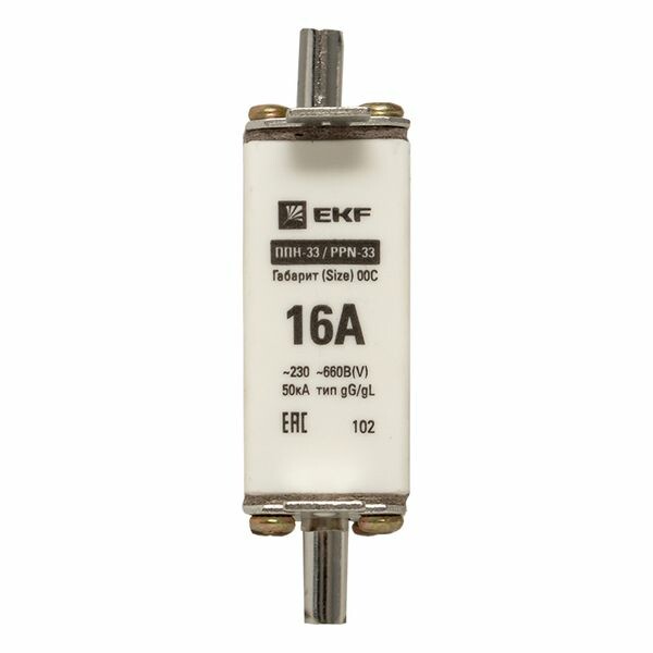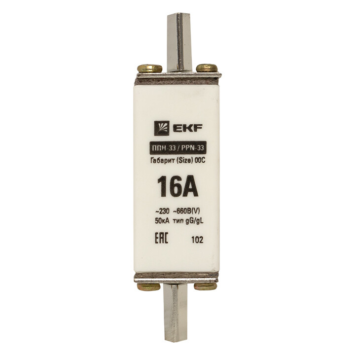 Плавкая вставка ППН-33 100/ 16А габарит 00С EKF. Предохранители плавкие ППН EKF, укомплектованные плавкими вставками типа gG/gL, предназначаются для защиты кабельных линий и промышленных электроустановок от токов перегрузки и короткого замыкания. Предохранители применяются в электрических сетях переменного тока частотой 50 Гц с напряжением до 660В. Применяются для крепления в распределительных и вводно-распределительных устройствах. Предохранители плавкие ППН могут устанавливаться в основание с держателем, а также в специально предназначенные рубильники. В комплект поставки предохранителей плавких ППН основание с держателем не входит и приобретается отдельно.