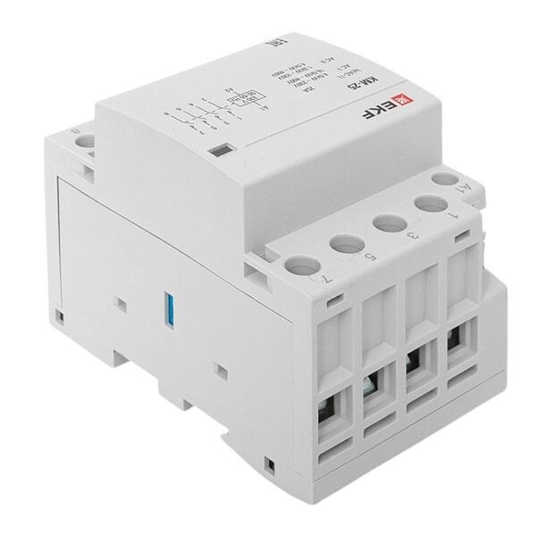 Модульные контакторы представляют из себя контактор в классическом корпусе модульного оборудования. Он состоит из неподвижных контактов, подвижных контактов, которые закреплены в подвижной части магнитной системы. Неподвижная часть магнитной системы закреплена жестко в корпусе КМ. Пружина препятствует смыканию контактов. При подаче напряжения на катушку управления в магнитной системе контактора возникает магнитное поле, которое, преодолевая сопротивление пружины, смыкает магнитную систему и замыкает контакты. При отключении напряжения с катушки управления пружина размыкает контакты. Возможна коммутация алюминиевым и медным проводом.