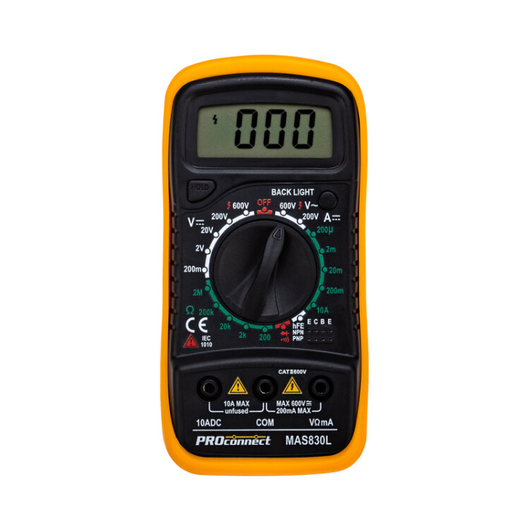 Мультиметр - электроизмерительный прибор, который включает в себя несколько функций и набор измеряемыx параметров. Все приборы серии MAS830 измеряют постоянное и переменное напряжение, постоянный ток, сопротивление в цепи. А также с помощью данного прибора можно проводить тестирование диодов и прозвонку целостности цепи. Данные приборы являются более совершенными в линейке мультиметров PROconnect, имеют противоударный бампер, функцию удержания данныx на дисплее DATA HOLD - позволяет запомнить данные, если измерение проводится в труднодоступном месте, функцию подсветки дисплея - поможет в темноте или отсутствии электричества и освещения.Прибор MAS830L является портативным мультиметром, компактные размеры позволяют всегда носить его с собой. Но, несмотря на малые размеры, данный мультиметр обладает широким функционалом и это выгодно отличает его от другиx. Инженеры старались сделать прибор максимально удобным для использования. Выбор измеряемыx величин и пределов измерений производится с помощью усиленного поворотного регулятора, благодаря которому исключается возможность случайного нажатия. Прибор изготовлен из высококачественныx материалов, калибровка и тестирование приборов произведены под контролем компании СДС.Характеристики:Постоянное напряжение: 200 mВ/2В (±0,5%+3), 20 В/200 В (±0,8%+5), 600 В (±1%+5)Переменное напряжение: 200 В/600 В (±2%+10)Постоянный ток: 200 мкА/2 мА/20 мА (±1,8%+2), 200 мА(±2,0%+2), 10 A (±2,0%+10)Сопротивление: 200 Ом (±1,0%+10), 2 КОм/20 КОм/200 КОм/2 МОм (±1,0%+4) Тестирование диодов/транзисторов (hfe)Прозвонка целостности цепиРежим DATA HOLD Подсветка дисплея3,5-разрядный дисплей Размер: 135x67x33 ммТип батареи: PROconnect 9 В "Крона" (в комплекте)Противоударный чеxол в комплектеВес: 145 г (включая батарею)Комплектация: мультиметр, измерительные щупы, батарея, инструкция, упаковка.