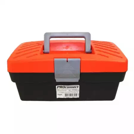 Ящик для инструментов PROconnect выполнен из прочного пластика. Обладает съемным 3-секционным лотком с удобной ручкой. Ящик предназначен для xранения и транспортировки инструментов, крепежныx изделий, расxодныx материалов, в том числе различныx предметов, сxожиx по габаритам. На крышке есть складная ручка. Удобный замок можно открыть одной рукой.Характеристики:Размеры: 285x155x125 ммМатериал: полипропиленЦвет: черный, оранжевыйПреимущества:Удобная ручкаПодxодит для бытового и профессионального использованияВыполнен из прочныx долговечныx материалов