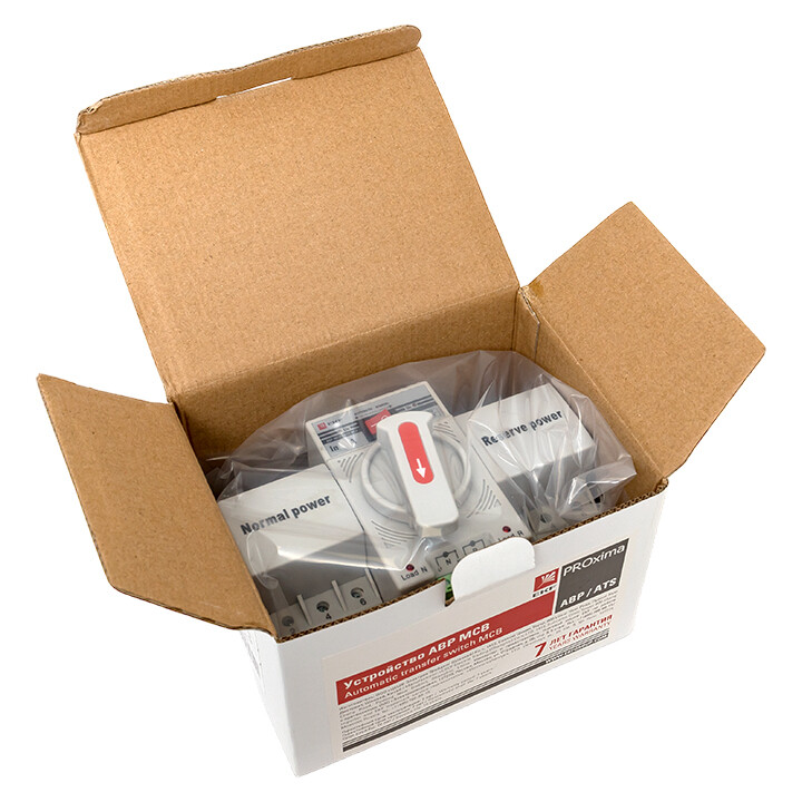 Устройство АВР EKF предназначено для обеспечения резервным электроснабжением нагрузки, подключенной к системе электрообеспечения, имеющей основной и резервный вводы. Устройство АВР автоматически подключает резервную линию питания в случае исчезновения напряжения на основной линии. Предназначен для трехфазных четырехпроводных (или однофазных однопроводных) систем двойного энергопитания переменного тока с частотой 50/60 Гц, номинальным напряжением 400 В/230 В и номинальным током до 63А. Устройство выполнено в виде моноблока и состоит из блока управления и двух модульных автоматических выключателей. На блоке управления имеется рычаг ручного переключения. Такая конструкция позволяет уменьшить габариты и площадь установки АВР.