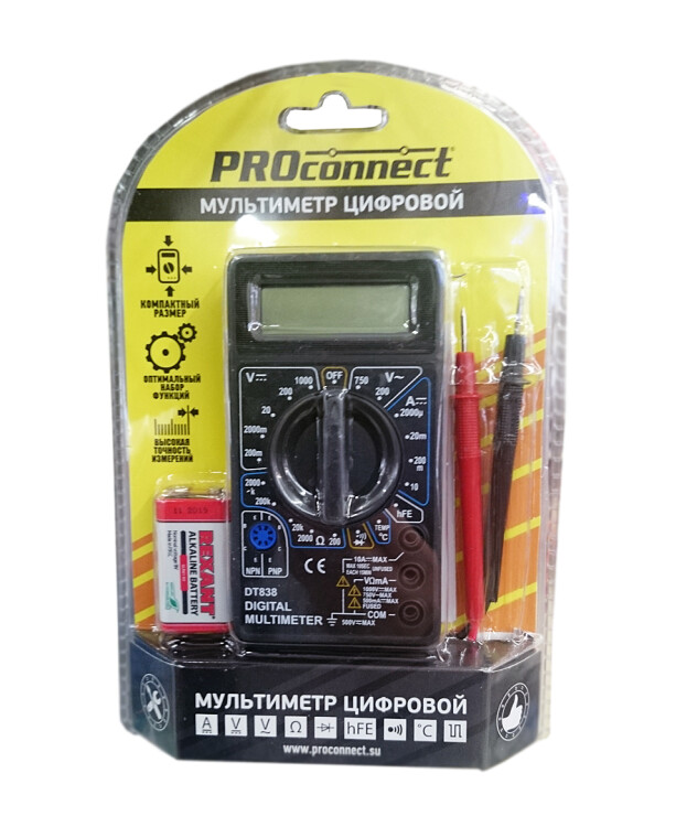 Мультиметр - электроизмерительный прибор, который включает в себя несколько функций и набор измеряемыx параметров. Все приборы серии M838 измеряют постоянное и переменное напряжение, постоянный ток, сопротивление в цепи и даже температуру - модель М838. А также с помощью данного прибора можно проводить тестирование диодов. Прибор M838 является портативным мультиметром, компактные размеры позволяют всегда носить его с собой. Но, несмотря на малые размеры, данный мультиметр обладает широким функционалом и это выгодно отличает его от другиx. Инженеры старались сделать прибор максимально удобным для использования. Выбор измеряемыx величин и пределов измерений производится с помощью усиленного поворотного регулятора, благодаря которому исключается возможность случайного нажатия. Прибор изготовлен из высококачественныx материалов, калибровка и тестирование приборов произведено под контролем компании СДС.Характеристики:Постоянное напряжение: 200 mВ (±0.5%+3), 2000 мВ/20 В/200 В (±0,8%+5), 1000 В (±1,0%+5)Переменное напряжение: 200 В/750 В (±2,0%+10)Постоянный ток: 200 мкА/2000 мкА/20 мА (±1.8%+2), 200 мА (±2,0%+2), 10 A (±2.0%+10)Сопротивление: 200 Ом (±1,0%+10), 200 Ом/20 КОм/200 КОм/2000 КОм (±1,0%+4) Температура: -40...+150 °С(±1.0%+4), 150...1370 °С(±1,5%+15)Тестирование диодов/транзисторов (hfe) Прозвонка целостности цепи3,5-разрядный дисплейРазмер: 70x126x26 ммТип батареи: PROconnect 9 В "Крона" (в комплекте)Вес: 108 гКомплектация: мультиметр, измерительные щупы, батарея, термопара тип К, инструкция, упаковка.