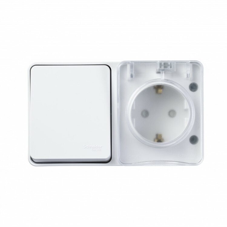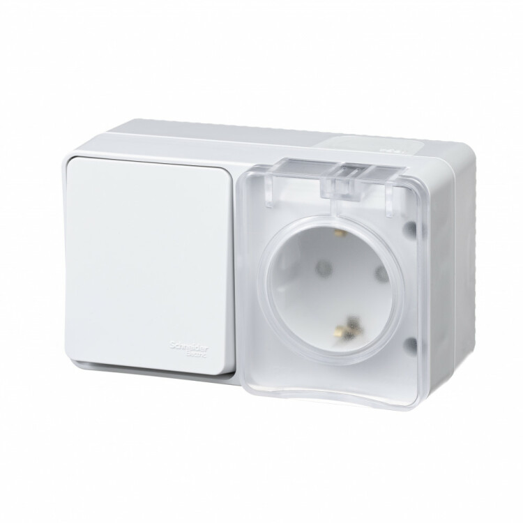 Блок для открытого монтажа из розетки с заземлением со шторками (16А, 250В) и 1-клавишного выключателя (10А).