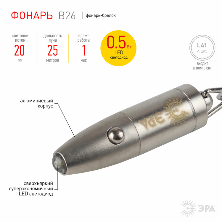 Мини фонарь B26 - полезный и практичный аксессуар, миниатюрный брелок с мощным светодиодом. Несмотря на свои маленькие размеры, фонарик светит ярким белым светом, не искажающим цвета, а дальность луча составляет 25 метров. Необычный брелок всего лишь 4 см в длину, то есть вообще не занимает места, но находится всегда под рукой. Для того, чтобы пристегнуть брелок к рюкзаку или ключам используется специальный карабин. Корпус выполнен из анодированного алюминия, что позволяет защитить фонарик от механических повреждений и падений. На самом деле брелоки обычно легко царапаются в сумочке или в кармане, но металл из которого сделан брелок B26 позволяет ему долго сохранять презентабельный внешний вид и не царапаться. Для включения фонарик надо нажать на кнопку, света вполне достаточно, чтобы подсветить что-то при необходимости. Фонарик питается от 4-х батареек, которые идут в комплекте, так что функциональный фонарик-брелок сразу же готов к использованию.