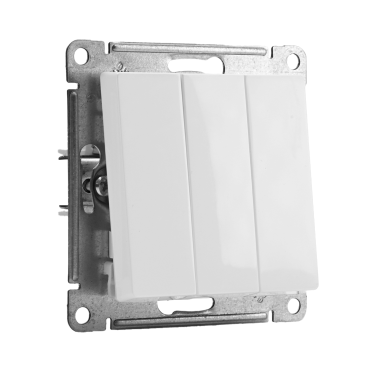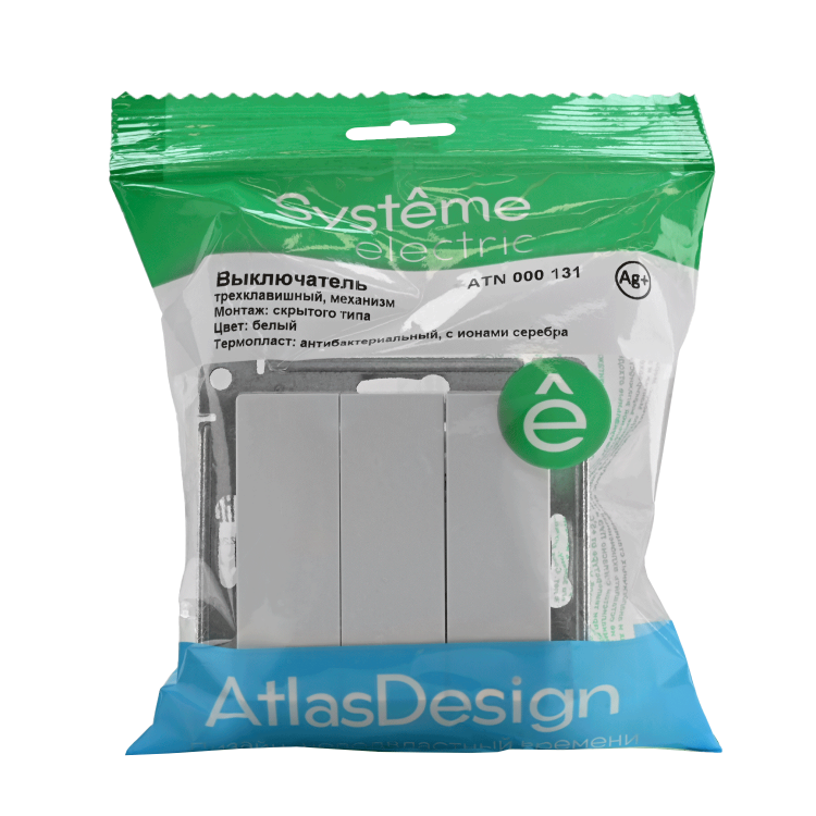 Механизм Systeme Electric (ранее Schneider Electric) серии AtlasDesign в цвете белый выключателя 3-клавишного подходит для сетей 250 В, на ток 10 А. Пластик с ионами серебра в белом цвете обеспечивает антибактериальный эффект. Трёхклавишный выключатель позволяет управлять тремя источниками света из одной точки. Лицевые детали из качественного ABS-пластика, устойчивого к царапинам и УФ-излучению. Усиленные прямые монтажные лапки для лучшей фиксации механизма в монтажной коробке.