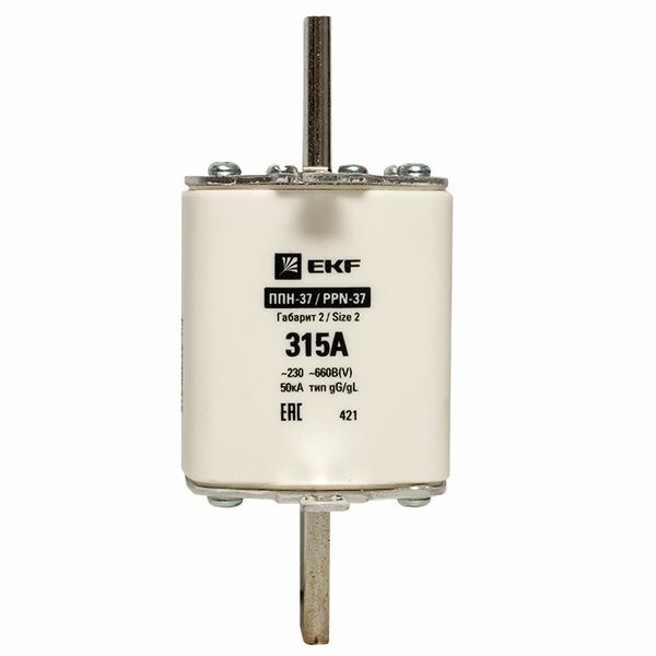 Плавкая вставка ППН-37 400/315А габарит 2 EKF. Предохранители плавкие ППН EKF, укомплектованные плавкими вставками типа gG/gL, предназначаются для защиты кабельных линий и промышленных электроустановок от токов перегрузки и короткого замыкания. Предохранители применяются в электрических сетях переменного тока частотой 50 Гц с напряжением до 660В. Применяются для крепления в распределительных и вводно-распределительных устройствах. Предохранители плавкие ППН могут устанавливаться в основание с держателем, а также в специально предназначенные рубильники. В комплект поставки предохранителей плавких ППН основание с держателем не входит и приобретается отдельно.