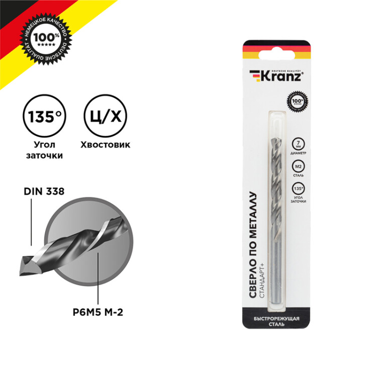 KRANZ Сверло по металлу 7х109х96 мм «Стандарт+» (P6M5 M-2) (1 шт. в блистере) DIN 338