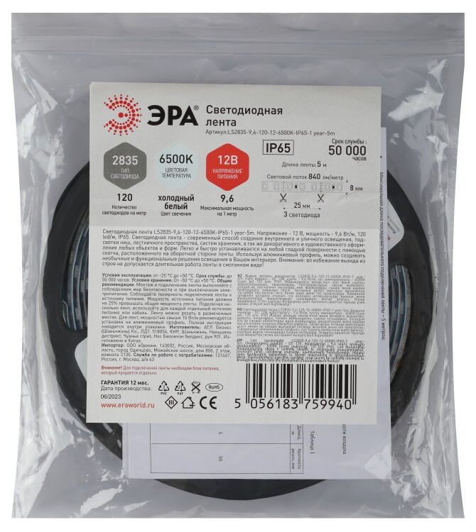 Светодиодная лента ЭРА LS2835 -9,6-120-12-6500K-IP65-1 year-5m (80/1440) со степенью защиты от пыли и влаги IP65 - современный способ создания внутреннего освещения, подсветки ниш, лестничного пространства, систем хранения, а также декоративного и художественного оформления любых объектов и форм в помещениях с повышенным уровнем влажности и уличного освещения. Легко и быстро устанавливается на любой гладкой поверхности с помощью скотча, расположенного на оборотной стороне ленты. Используя алюминиевый профиль, можно создавать необычные и функциональные решения освещения в Вашем интерьере. Рабочее напряжение ленты составляет 12В, а мощность равна 9,6 Вт/м. Светодиодная лента обладает световым потоком 840 Лм/м, и цветом свечения - холодный белый (6500 K)