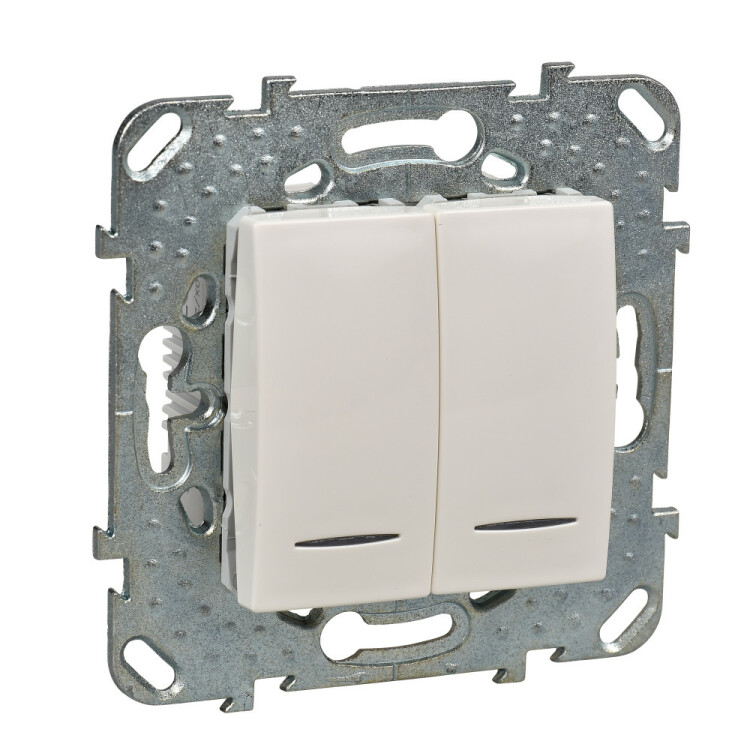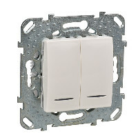 Переключатель двухклавишный Schneider Electric UNICA (бежевый) с подсветкой предназначен для сетей до 250 В на ток до 10 А.