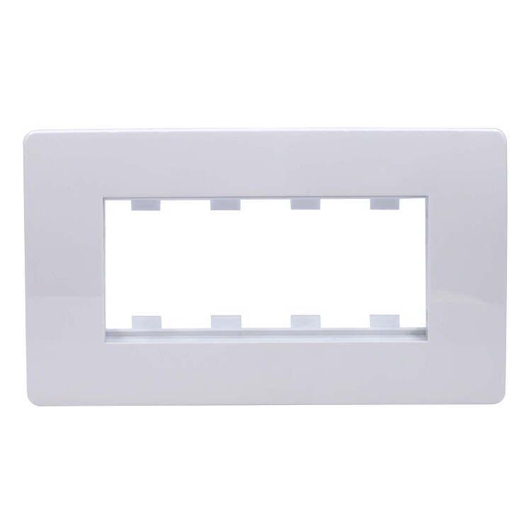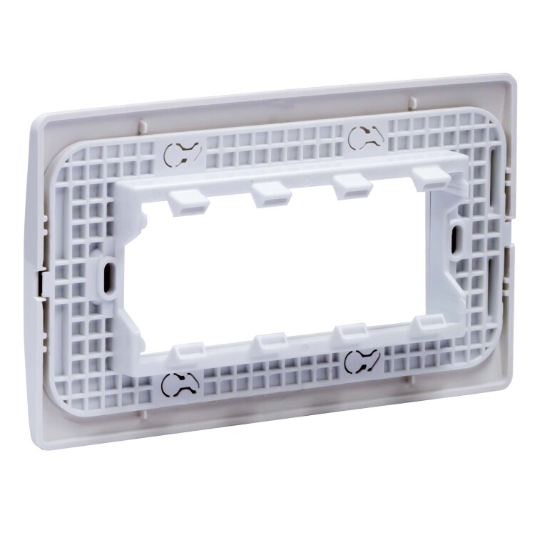 Каркас в сборе с рамками под 4 модуля электроустановочных изделий ЭУИ «Вива» (Viva). Назначение: организация рабочего места. Условия монтажа: электроустановочное изделие серии ЭУИ «Вива» (Viva) монтируется в каркас защёлкиванием; каркас в коробку монтируется саморезом; рамка на каркас — защёлкиванием. Характеристики: материал — АБС-пластик. Комплектация: каркас; рамка. Цвет белый