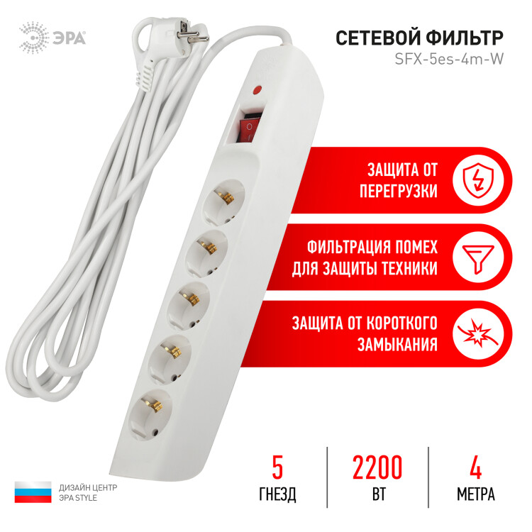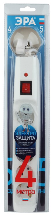 Сетевой фильтр ЭРА SFX-5es-4m-W рассчитан на одновременное подключение большого количества техники. На корпусе расположены 5 розеток с заземлением. Отличительной особенностью модели выступает прочный корпус из негорючего полипропилена, надежный трехжильный провод, терморазмыкатель на 10А, который защищает приборы от перегрузки, а также варистор, конденсатор и дроссель для защиты подключенных устройств от импульсных и высокочастотных помех. На корпусе расположена кнопка выключения. Сетевой фильтр разработан собственными инженерами компании ЭРА, проходят проверку на всех этапах производства, гарантируя высокое качество его исполнения. Длина провода модели составляет целых 4 метра, это очень удобный удлинитель. Сетевой фильтр имеет кольцо на шнуре, благодаря чему прибор можно быстро выдернуть из сети. Сетевые фильтры разрабатываются собственным техническим бюро, проходит проверку на всех этапах производства, что обеспечивает высокое качество продукта.