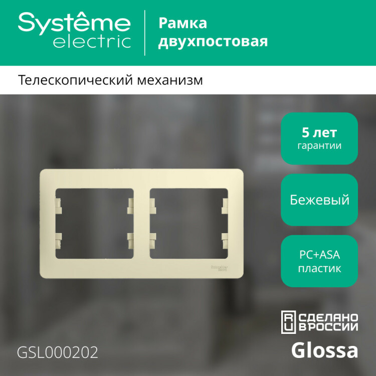 Рамка Systeme Electric (ранее Schneider Electric) серии Glossa (цвет бежевый) двухместная. Устанавливается в горизонтальном положении. Выполнена из материала PС+ASA, стойкого к УФ-излучению и появлению царапин. Позволяет гармонично вписать электроустановочное изделие в интерьер помещения.