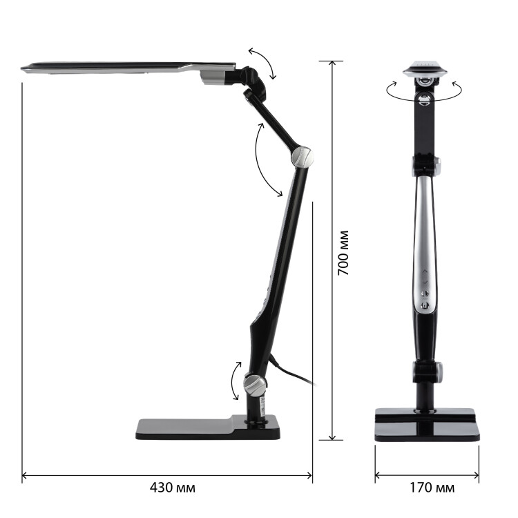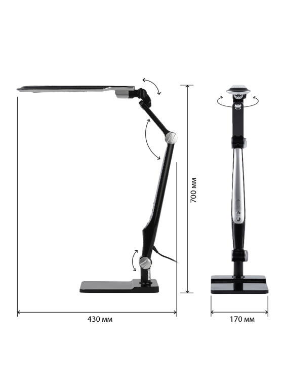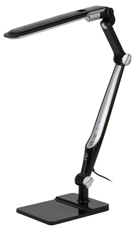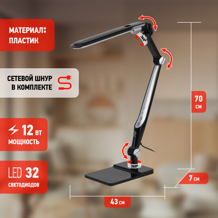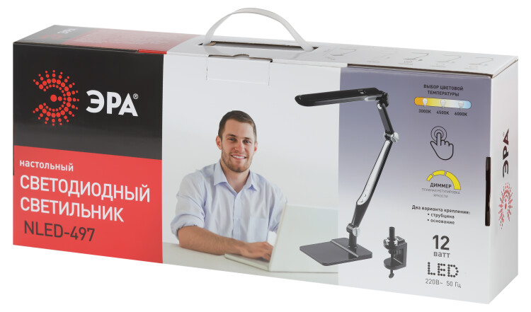 Настольный светильник ЭРА NLED-497-12W-BK со светодиодами (LED) в качестве источников света. Оснащен сенсорным управлением с возможностью выбора цветовой температуры (теплый, нейтральный или холодный свет). Плавный диммер для регулировки яркости. Светильник сохраняет выбранные настройки при включении-выключении. Высота плафона регулируется двухсекционной сгибающейся стойкой, направление света регулируется поворотом и наклоном плафона в любую сторону. Два варианта крепления в комплекте: устойчивое основание и струбцина.