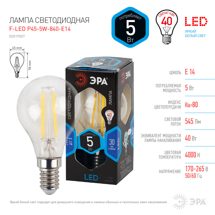 ЭРА Лампа светодиодная F-LED P45-5W-840-E14 5Вт филамент шар нейтральный белый свет Е14