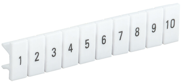 Устанавливаются в соответствующие пазы клеммы. Выполнены в виде пластин с десятью маркировочными площадками. Каждая площадка легко отсоединяется друг от друга.