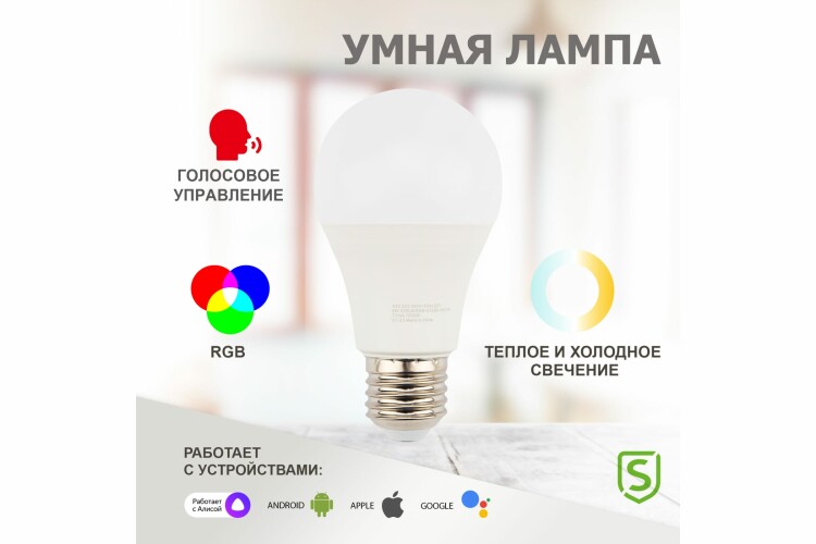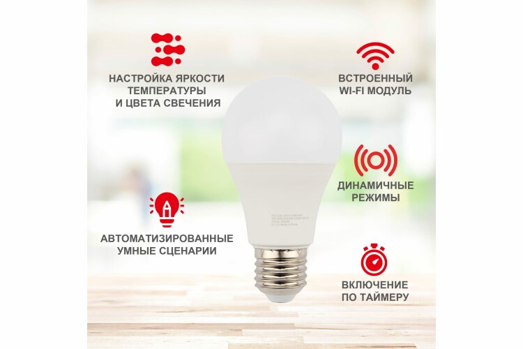 Умная светодиодная лампочка предназначена для освещения помещений разного типа. От обычной лампочки ее отличает наличие встроенного Wi-Fi модуля, что позволяет управлять ею дистанционно. С помощью приложения пользователь может не только включать и выключать свет, но также устанавливать автоматическое включение в соответствии с выбранным временем, регулировать яркость и темпер атуру освещения, выбирать цвет свечения (RGB) и т.д. Прибор может использоваться самостоятельно, а также совместно с другими устройствами интеллектуальной системы "Умный дом" и принимать участие в автоматизированныx умныx сценарияx.