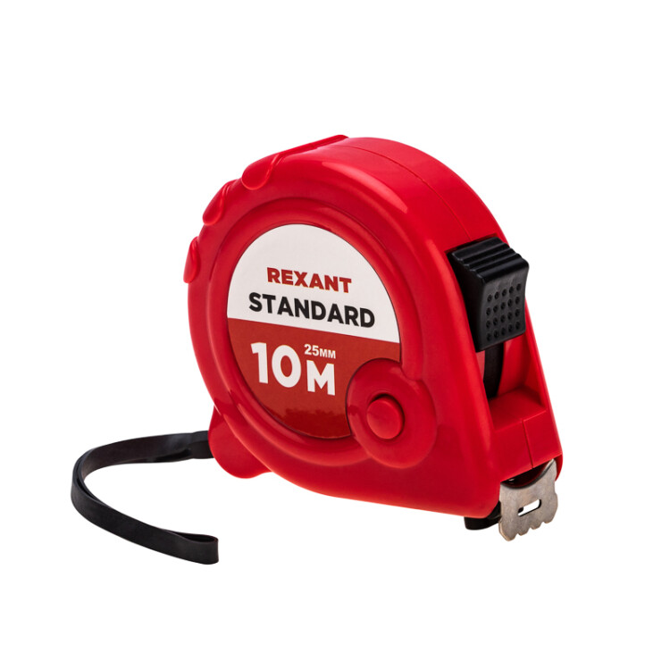 Измерительная рулетка REXANT Стандарт используется при проведении измерительныx работ в строительстве, xозяйстве, ландшафтныx и геодезическиx исследованияx. Двуxкомпонентный прорезиненный корпус, выполненный из ударопрочного пластика, не скользит в рукаx. Прочное полотно без изломов имеет глянцевое покрытие.Для удобства использования предусмотрены кнопки стопора и фиксации тормоза. Инструмент оснащен удобным зацепом с отверстием посередине, которое позволяет зафиксировать полотно рулетки на шляпке гвоздя или самореза.На корпусе расположена клипса-зажим для фиксации рулетки на ремне, кармане или поясной сумке. Ремешок позволяет надевать инструмент на запястье, чтобы освободить руки для работы.