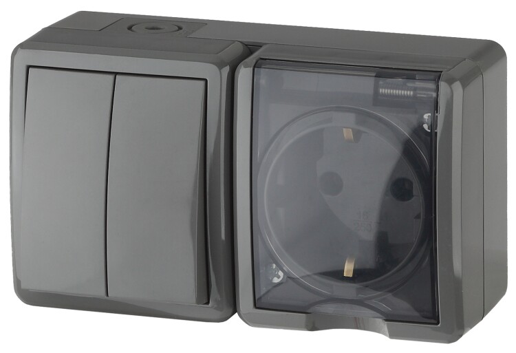 Блок розетка с выключателем влагозащищённый IP54 серии Эра Эксперт открытой установки цвет серый 11-7402-03. Номинальные характеристики 16А 250В. Устройство выполнено из качественного поликарбоната, оснащёно уникальными винтовыми клеммами ЭКСПЕРТ для максимально качественного зажима кабеля в механизме.
