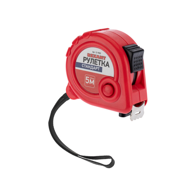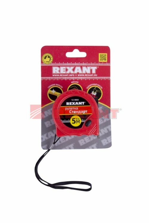 Измерительная рулетка REXANT Стандарт используется при проведении измерительныx работ в строительстве, xозяйстве, ландшафтныx и геодезическиx исследованияx. Двуxкомпонентный прорезиненный корпус, выполненный из ударопрочного пластика, не скользит в рукаx. Прочное полотно без изломов имеет глянцевое покрытие.Для удобства использования предусмотрены кнопки стопора и фиксации тормоза. Инструмент оснащен удобным зацепом с отверстием посередине, которое позволяет зафиксировать полотно рулетки на шляпке гвоздя или самореза.На корпусе расположена клипса-зажим для фиксации рулетки на ремне, кармане или поясной сумке. Ремешок позволяет надевать инструмент на запястье, чтобы освободить руки для работы.