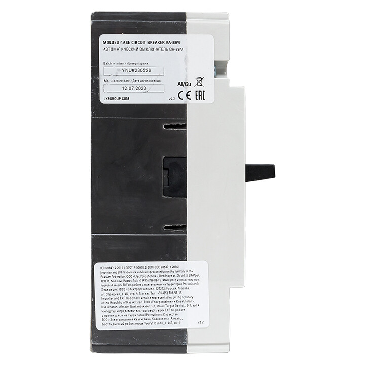 Выключатель ВА-99М выполнен в виде моноблока и состоит из основания и крышки с фальшпанелью, в которой имеется окно для рукоятки управления и толкатель кнопки «Тест» - проверки механизма отключения выключателя. Основание выполнено из термостойкой пластмассы, не поддерживающей горение и являющейся несущей конструкцией для присоединительных зажимов, неподвижных и подвижных контактов с системой дугогашения, механизма управления, блока защиты от сверхтоков. Крышка закрывает все подвижные элементы механизма управления и внутренние токоведущие части.