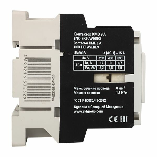 Контакторы КМЭ EKF AVERES состоят из корпуса, закрепленных в нем неподвижных контактов, подвижных контактов, которые закреплены в подвижной части магнитной системы. Неподвижная часть магнитной системы закреплена жестко в корпусе КМЭ. Пружина препятствует смыканию контактов. При подаче напряжения на катушку управления в магнитной системе контактора возникает магнитное поле, которое, преодолевая сопротивление пружины, смыкает магнитную систему и замыкает контакты. При отключении напряжения с катушки управления пружина размыкает контакты. Возможна коммутация алюминиевым и медным проводом.