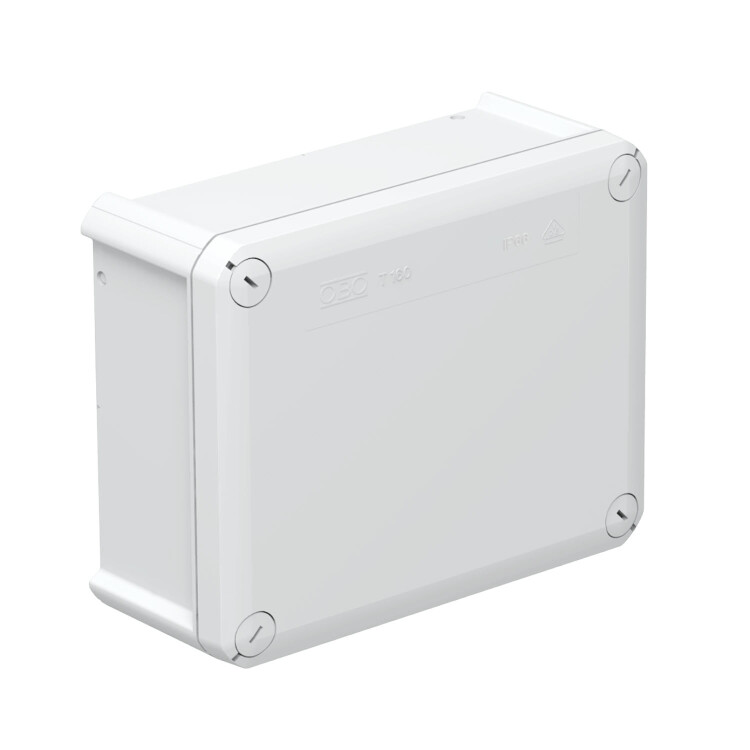 Кабельная распределительная коробка для соединения кабелей и проводов в помещении и в защищенных зонах вне помещения. Прямоугольная форма без вводов. Подходит для настенного и потолочного монтажа и установки на монтажных пластинах с возможностью наружного и внутреннего закрепления и монтажа поверх угловых колпаков. Крышка с быстроразъемным соединением может быть опломбирована. Изготовлено из материалов, не содержащих галогены. Кабельная распределительная коробка согласно DIN EN 60670. Огнестойкость согласно DIN EN 60695-2-11, температура испытания 650°C. Ударопрочность IK04 согласно DIN EN 50102.