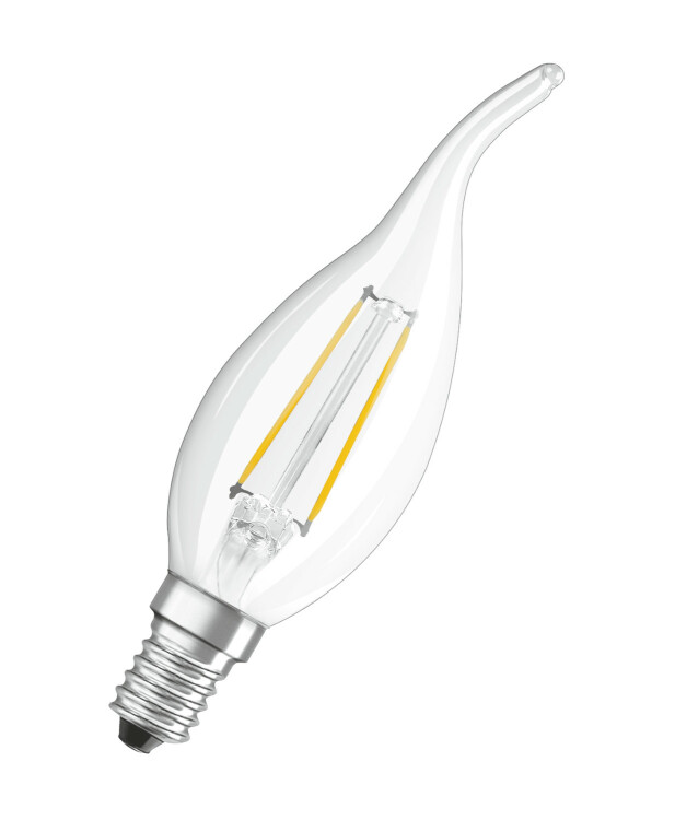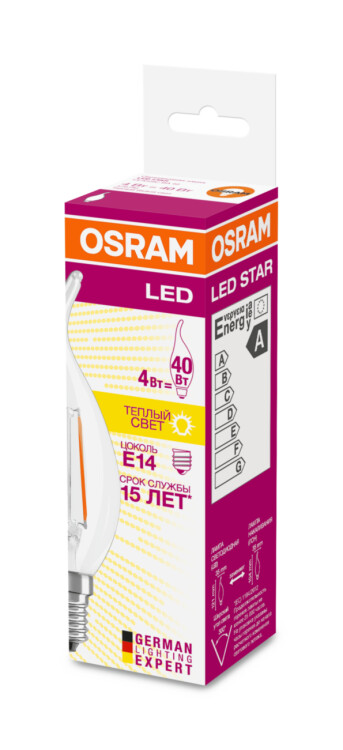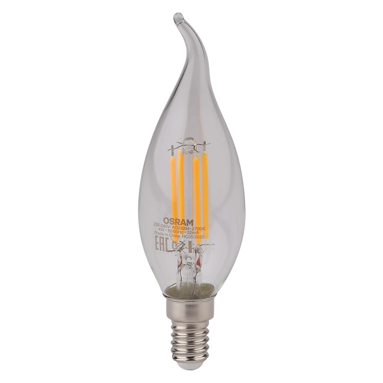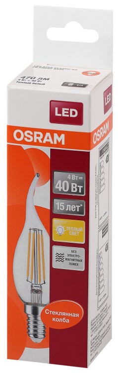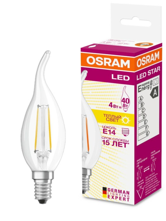 Лампа светодиодная филаментная OSRAM LED Star BA, 470 лм, 4Вт (замена 40Вт), 2700K (теплый белый свет). Цоколь E14, колба BA, угол пучка 300°. Исполнение колбы прозрачное, стекло. Напряжение питания 220-240В. Товар сертифицирован