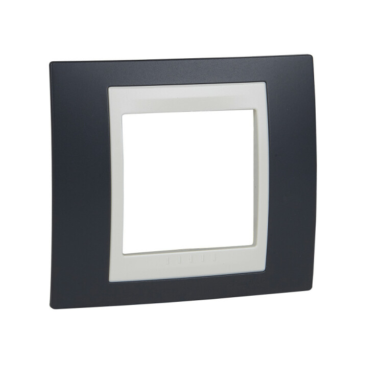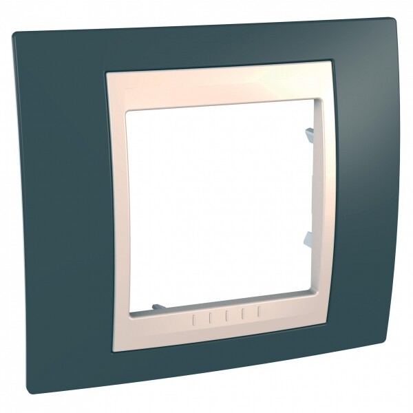 Рамка Schneider Electric UNICA ХАМЕЛЕОН (серо-зелёный) одинарная с бежевой декоративной вставкой.
