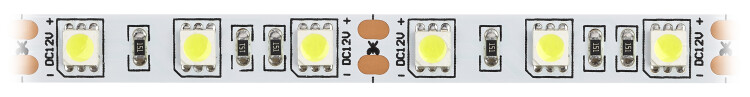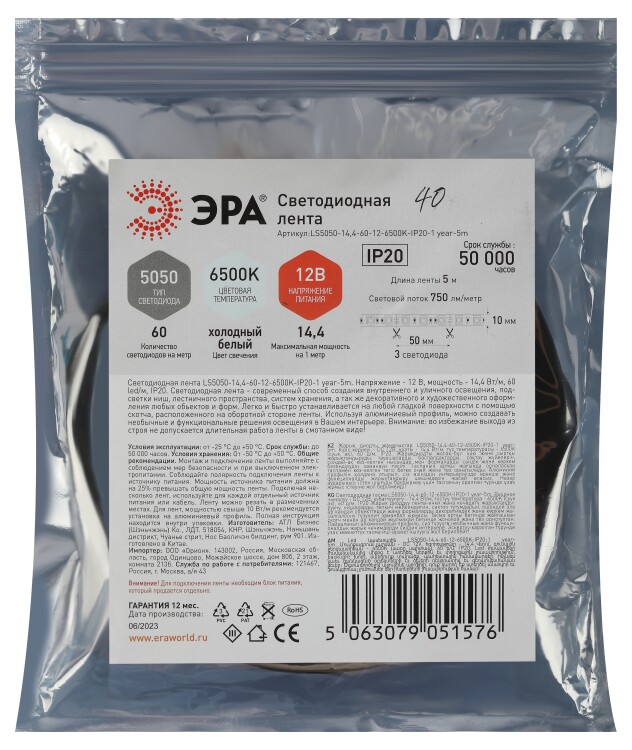 Светодиодная лента ЭРА LS5050 -14,4-60-12-6500K-IP20-1 year-5m холодный белый 5м со степенью защиты от пыли и влаги IP20 - современный способ создания внутреннего освещения, подсветки ниш, лестничного пространства, систем хранения, а также декоративного и художественного оформления любых объектов и форм в помещениях. Легко и быстро устанавливается на любой гладкой поверхности с помощью скотча, расположенного на оборотной стороне ленты. Используя алюминиевый профиль, можно создавать необычные и функциональные решения освещения в Вашем интерьере. Рабочее напряжение ленты составляет 12В, а мощность равна 14,4 Вт/м. Светодиодная лента обладает световым потоком 750 Лм/м, и цветом свечения - холодный белый (6500 K) ВНИМАНИЕ: - светодиодную ленту с напряжением 12В допустимо подключать последовательно отрезками не более 5 м. - для светодиодных лент с мощностью выше 9.6 Вт обязательно использование алюминиевого профиля для дополнительного охлаждения. Это существенно продлит срок службы светодиодной ленты. - во избежание выхода из строя не допускается длительная работа ленты в смотанном виде