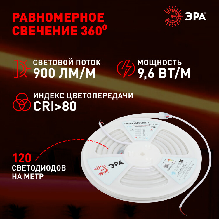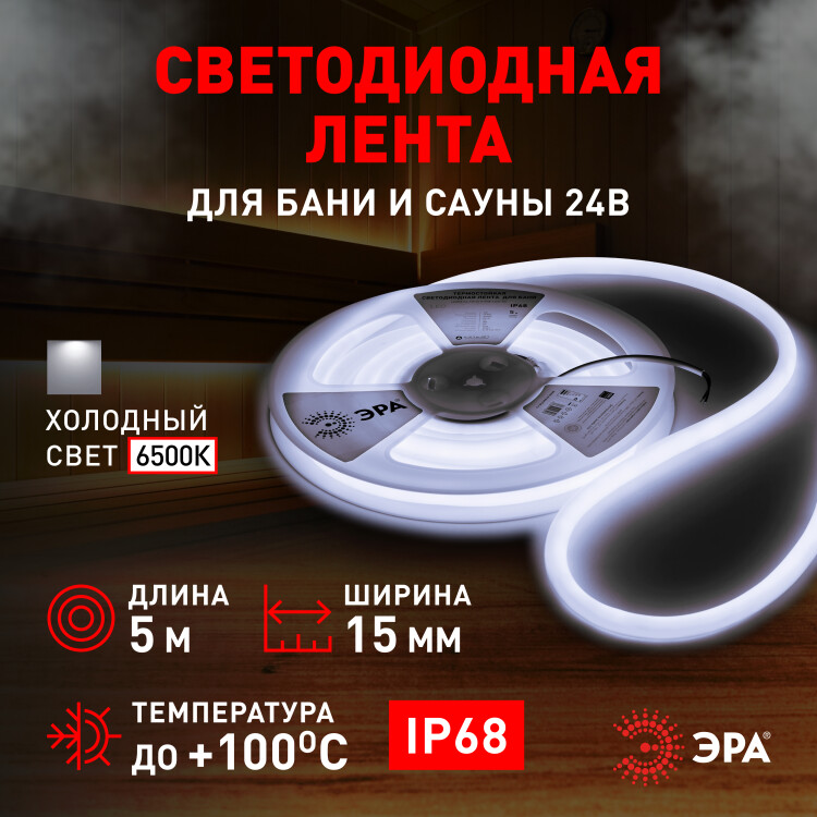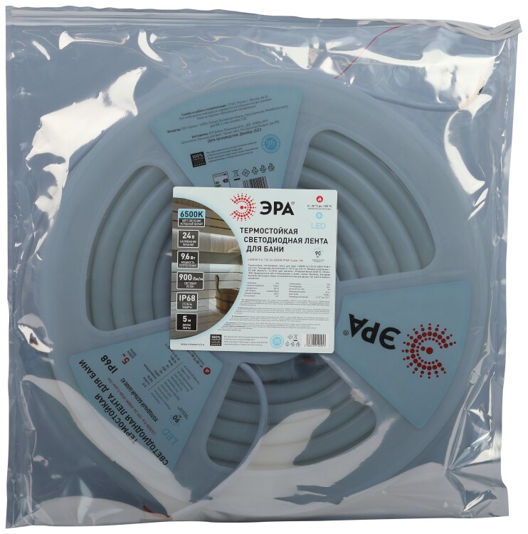 Термостойкая светодиодная лента LS2835-9,6-120-24-6500K-IP68-3 year-5m со степенью защиты от пыли и влаги IP68 - современный способ создания подсветки и освещения в банях и саунах. Светодиодная лента предназначена для эксплуатации при температурах от -30 С до + 100 С. Легко и быстро устанавливается на любой поверхности с помощью крепежей, которые есть в комплекте со светодиодной лентой. Светодиодная лента не требует пайки. Для подключения можно использовать коннектор Б0062253 - LS-connector-15mm-D-IP68-bath. Рабочее напряжение ленты составляет 24 В, а мощность равна 9,6 Вт/м. Светодиодная лента обладает световым потоком 900 лм/м с холодным белым цветом свечения (6500 К). Угол рассеивания 360. ВНИМАНИЕ: термостойкую светодиодную ленту с напряжением 24В допустимо подключать последовательно отрезками не более 5 м. Во избежание выхода из строя не допускается длительная работа ленты в смотанном виде.