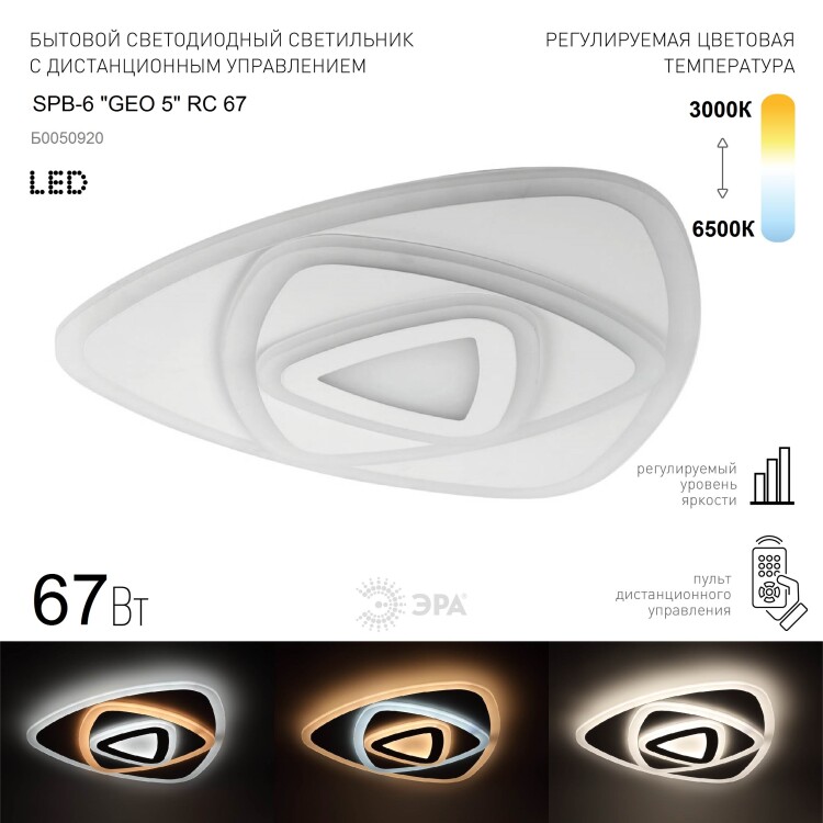 Светильник потолочный SPB-6 "GEO 5" мощностью на 67 Вт. Эта лампа станет современной альтернативой громоздким люстрам, позволит разнообразить интерьер за счет дизайна, а также сделает возможным выбор комфортной для Вас цветовой температуры без дополнительных затрат. В комплекте с люстрой идет пульт д/у, который станет Вашим главным помощником в регулировке изделия.Главная особенность LED светильника возможность выбора цветовой температуры от 3400 до 5500К. Кроме того, он оснащен плавным переключателем яркости, который помогает глазам быстро приспособиться к свету в комнате. У светодиодной потолочной люстры также имеется "Ночной режим", который снижает яркость до минимального уровня. Потолочный светильник SPB-6 "GEO 5" это возможность преобразить интерьер на кухне, в коридоре или в спальне, сэкономив пространство. Попробуйте практичное световое решение для своего дома выберите стиль и удобство.