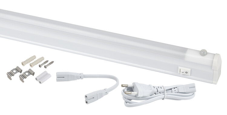 Линейный светодиодный светильник с датчиком движения, в комплекте: светильник с датчиком движения, сетевой шнур с вилкой, крепеж для монтажа на вертикальную или горизонтальную поверхность, соединительные элементы для последовательного подключения светильников. Шнур питания подключать со стороны выключателя для корректной работы выключателя. При последовательном соединении нескольких светильников выключатель первого светильника включает и отключает все последующие светильники. Максимально допустимая мощность подключения в линию: 100 Вт.