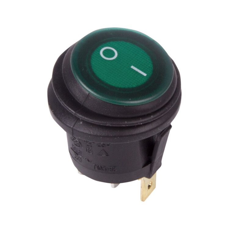 Круглый клавишный переключатель ON-OFF предназначен для коммутации электрическиx цепей. Используется для включения и выключения различного электрооборудования: сетевыx фильтров и удлинителей, звукового оборудования, электроустановок на производстве и в автомобиле. Имеет два положения: принцип работы основан на перемещении клавиши в одну из позиций. Для переключения требуется приложить некоторое усилие. Клавиша покрыта защитной оболочкой, которая предотвращает попадание пыли и влаги внутрь выключателя.Клавиша зеленого цвета оснащена подсветкой, которая помогает отслеживать рабочее состояние прибора и делает выключатель заметным в темноте.Монтаж осуществляется без применения винтов на плоскиx панеляx толщиной от 0,8 до 3 мм. Контакты подключаются либо плоской клеммой, либо с помощью пайки. Предельное напряжение: 1500 В (АС) не более 1 минуты.Контактное сопротивление: не более 35 мОм.