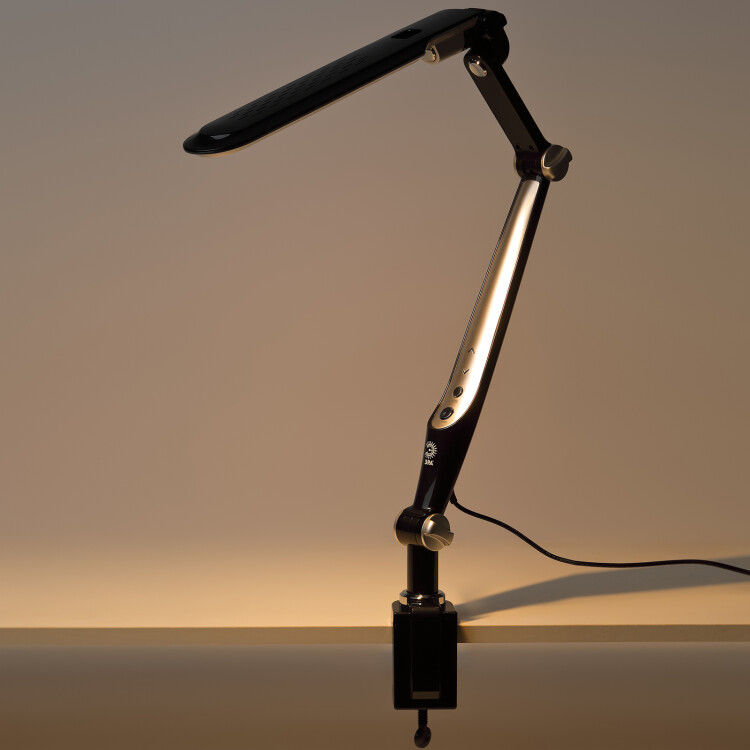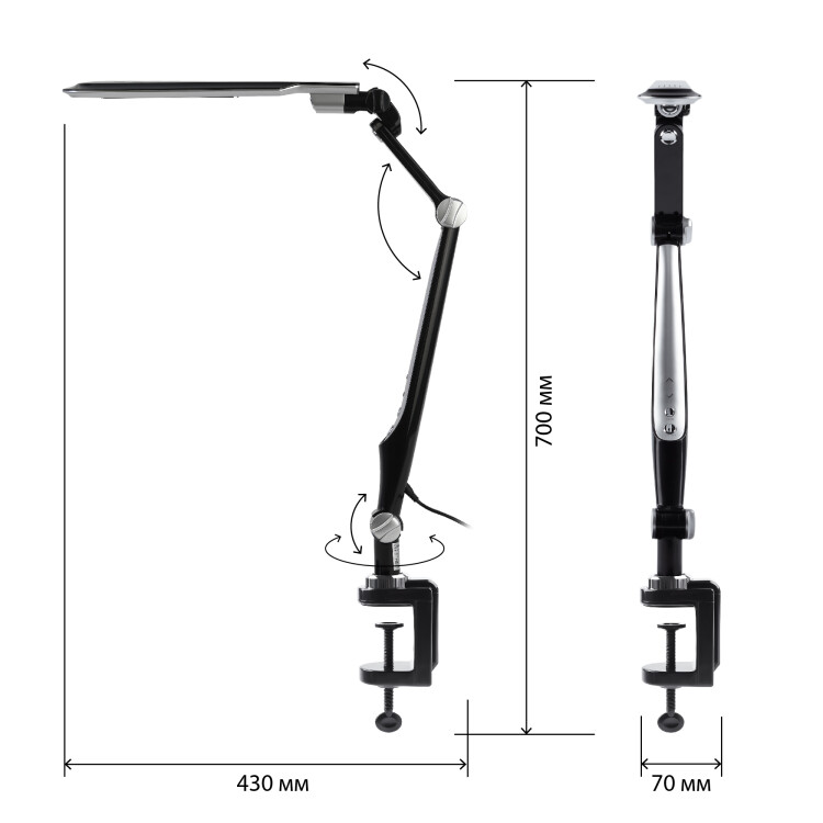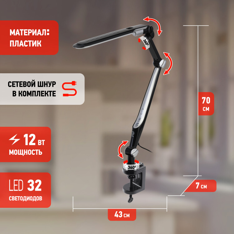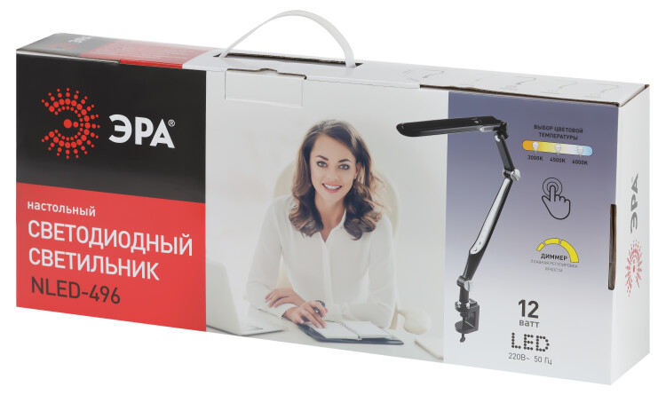 Настольный светильник ЭРА NLED-496-12W-BK со светодиодами (LED) в качестве источников света. Оснащен сенсорным управлением с возможностью выбора цветовой температуры (теплый, нейтральный или холодный свет). Плавный диммер для регулировки яркости. Светильник сохраняет выбранные настройки при включении-выключении. Высота плафона регулируется двухсекционной сгибающейся стойкой, направление света регулируется поворотом и наклоном плафона в любую сторону. Удобное крепление на струбцину.