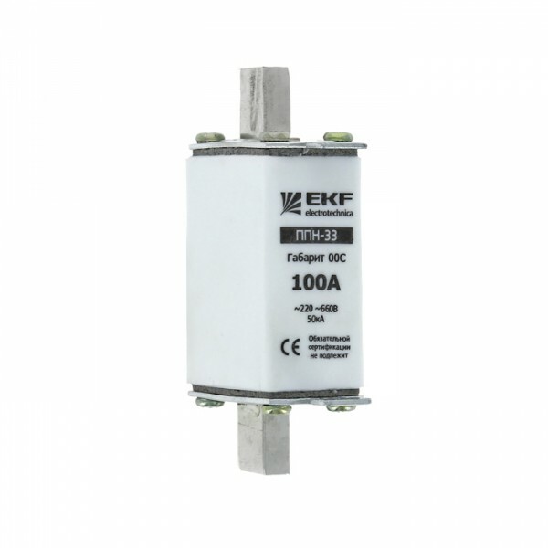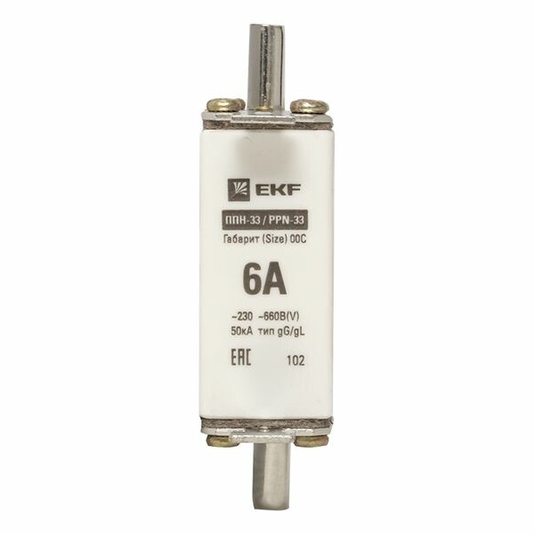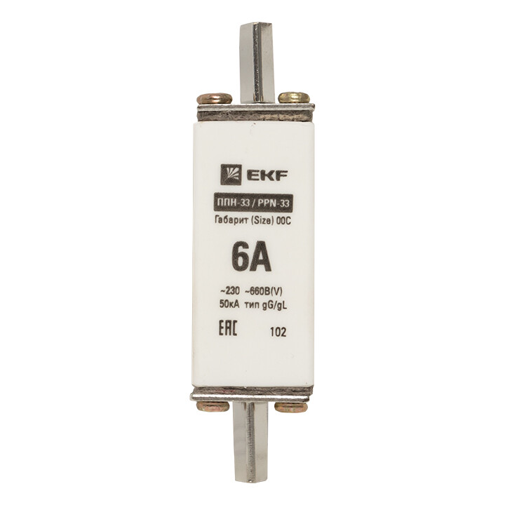 Плавкая вставка ППН-33 100/6А габарит 00С EKF. Предохранители плавкие ППН EKF, укомплектованные плавкими вставками типа gG/gL, предназначаются для защиты кабельных линий и промышленных электроустановок от токов перегрузки и короткого замыкания. Предохранители применяются в электрических сетях переменного тока частотой 50 Гц с напряжением до 660В. Применяются для крепления в распределительных и вводно-распределительных устройствах. Предохранители плавкие ППН могут устанавливаться в основание с держателем, а также в специально предназначенные рубильники. В комплект поставки предохранителей плавких ППН основание с держателем не входит и приобретается отдельно.