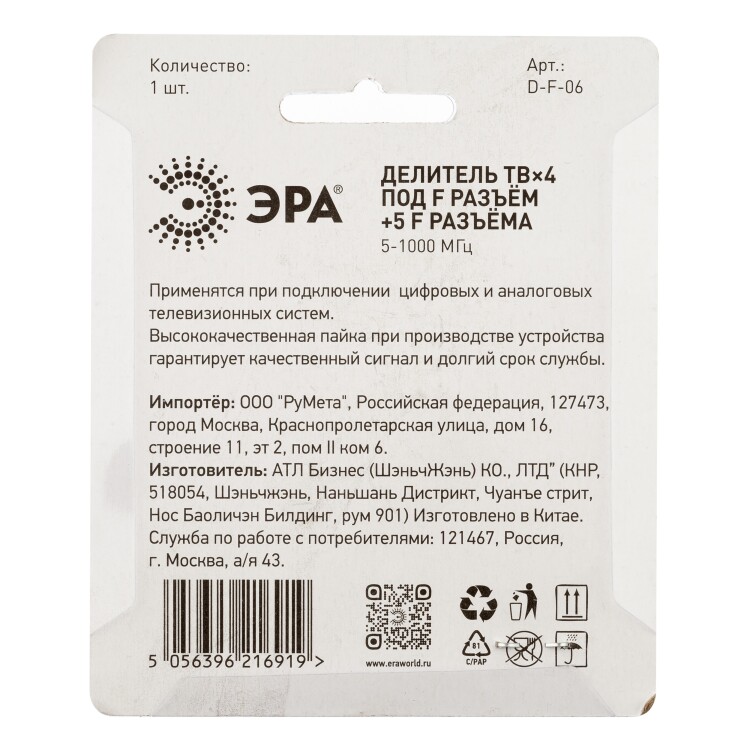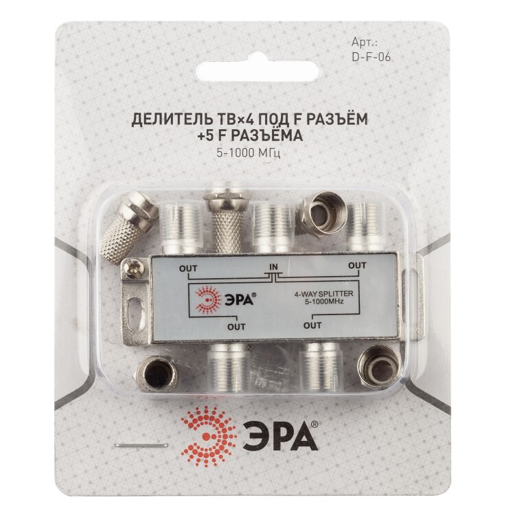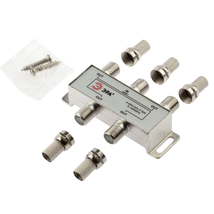 ЭРА Делитель ТВ 4 ответвления под F разъём в комплекте 5 F разъёмов 5-1000 МГц упаковка 1 шт.
