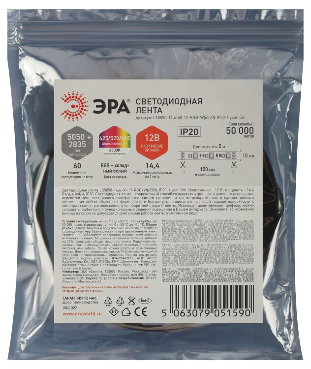 ЭРА Светодиодная лента LS5050-14,4-60-12-RGB+W(6500)-IP20-1 year-5m RGB+холодный белый 1 год