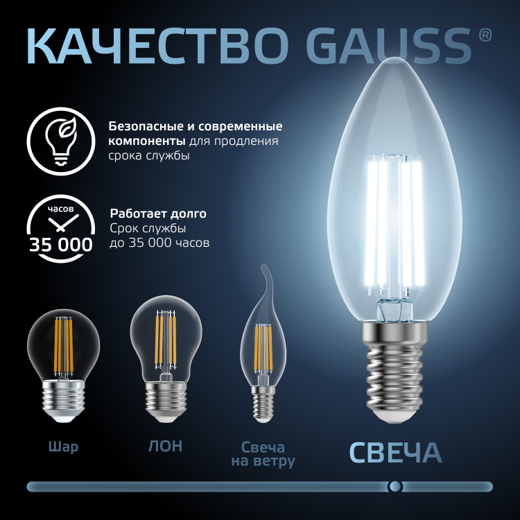 Светодиодные филаментные лампы GAUSS - это новейшие технологии в светотехнике. Лампы имеют привычный вид классических ламп накаливания, освещают пространство на 360о и дают больше света по сравнению с обычными светодиодными лампами за счет прозрачной колбы. Идеально подходят для хрустальных люстр и открытых светильников, а также для реализации дизайнерских решений, где важен вид классических ламп накаливания.