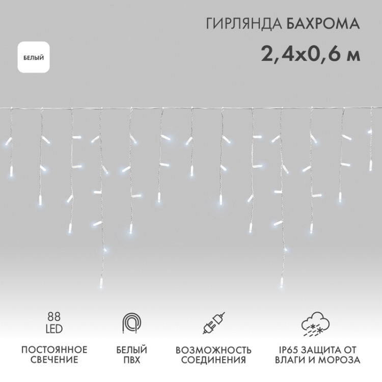 NEON-NIGHT Гирлянда Айсикл (бахрома) светодиодный, 2,4 х 0,6 м, белый провод, 230 В, диоды белые, 88 LED