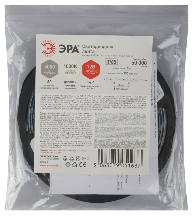 Светодиодная лента LS5050-14,4-60-12-4000K-IP65-1 year-5m со степенью защиты от пыли и влаги IP65 - современный способ создания внутреннего освещения, подсветки ниш, лестничного пространства, систем хранения, а также декоративного и художественного оформления любых объектов и форм в помещениях с повышенным уровнем влажности и уличного освещения. Легко и быстро устанавливается на любой гладкой поверхности с помощью скотча, расположенного на оборотной стороне ленты. Используя алюминиевый профиль, можно создавать необычные и функциональные решения освещения в Вашем интерьере. Рабочее напряжение ленты составляет 12 В, а мощность равна 14,4 Вт/м. Светодиодная лента обладает световым потоком 750 лм/м с дневным белым цветом свечения (4000К). ВНИМАНИЕ: - светодиодную ленту с напряжением 12В допустимо подключать последовательно отрезками не более 5 м. - для светодиодных лент с мощностью выше 9.6 Вт обязательно использование алюминиевого профиля для дополнительного охлаждения. Это существенно продлит срок службы светодиодной ленты. - во избежание выхода из строя не допускается длительная работа ленты в смотанном виде.
