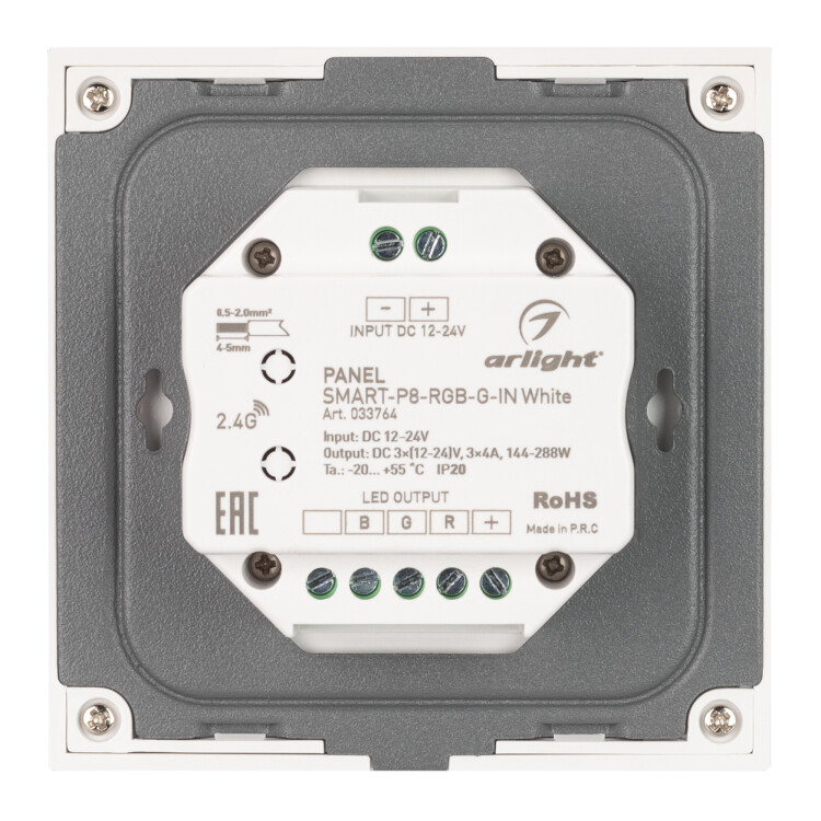Встраиваемая роторная стеклянная панель 2.4 ГГц, цвет белый. Для управления RGB источниками света (ШИМ). Управление цветом с помощью роторного вращателя. Работает в режиме master/slave и может выполнять функцию независимого контроллера. Питание/рабочее напряжение 12-24VDC, 3 канала по 4А максимальной нагрузки на канал, максимальная суммарная мощность 144-288W. Габариты 86х86х50 мм. Панель совместима с контроллерами и пультами серии SMART.