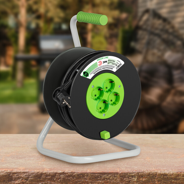 Удлинитель силовой ЭРА GREEN LINE на пластиковой катушке KAT-3x1.5-20m, 4 розетки с заземлением. Провод ПВС 3х1,5мм2, 20м. Мощность 16А/3500Вт. Используется для работы на строительных площадках или дачных участках. Удобен при работе с приборами, находящимися удаленно от стационарной розетки. Например, газонокосилки, электрические, пилы, триммеры или электродрели. Рама катушки сделана из высокопрочной стали, а пластиковой корпус катушки выполнен с применением негорючих добавок.