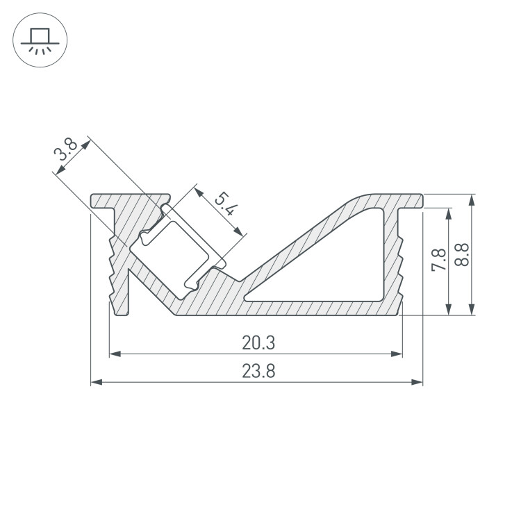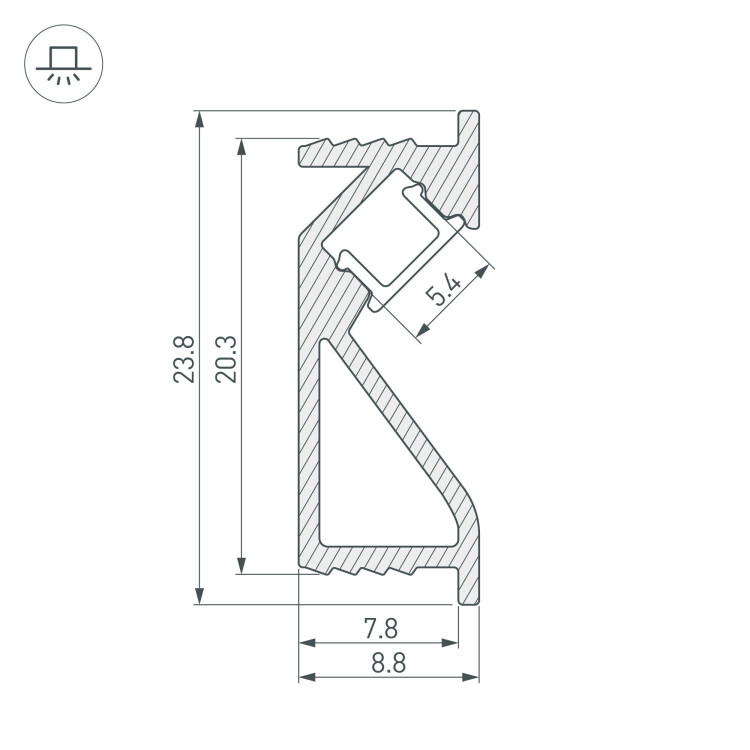 Алюминиевый анодированный профиль для светодиодных лент и линеек с боковым свечением. Габаритные размеры (L×W×H): 2000x23,8x8,8 мм, паз для установки 20,3 мм. Ширина площадки для ленты 5.4 мм. Экраны, заглушки и другие аксессуары приобретаются отдельно. Цена за 1 метр. Кратность заказа поставщику: 2 м.