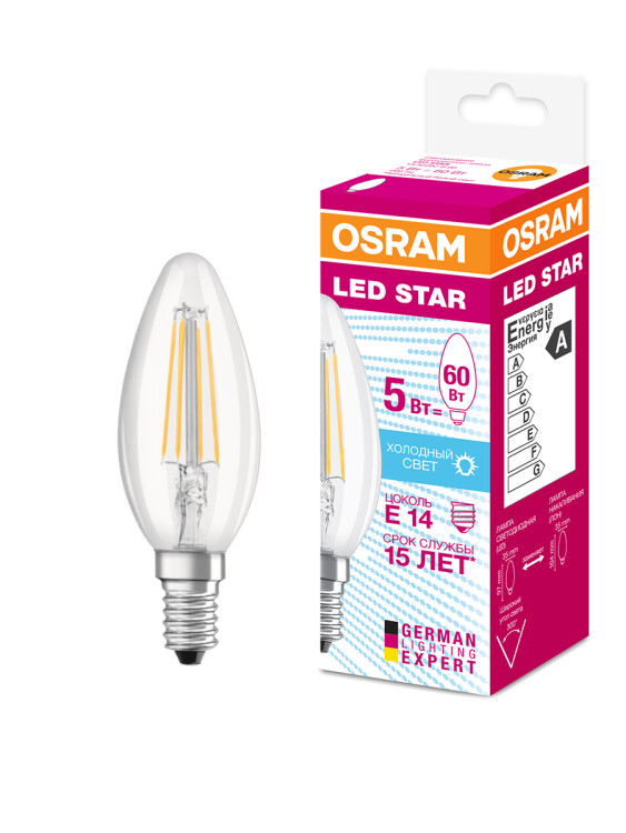Лампа светодиодная филаментная OSRAM LED Star B, 660 лм, 5Вт (замена 60Вт), 4000K (нейтральный белый свет). Цоколь E14, колба B, угол пучка 300°. Исполнение колбы прозрачное, стекло. Напряжение питания 220-240В. Товар сертифицирован