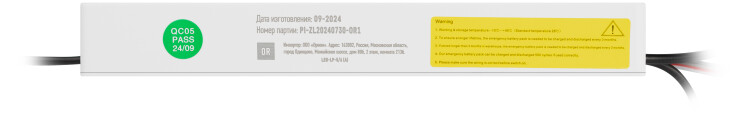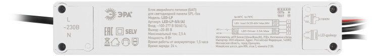 Блок аварийного питания для панелей SPL 5/6/7/9. Позволяет превратить светильник в светильник аварийного назначения с резервным освещением в течение одного часа. Выходное напряжение 20-85В, максимальный ток 2,5А, время работы 1,5часа, время заряда 24ч