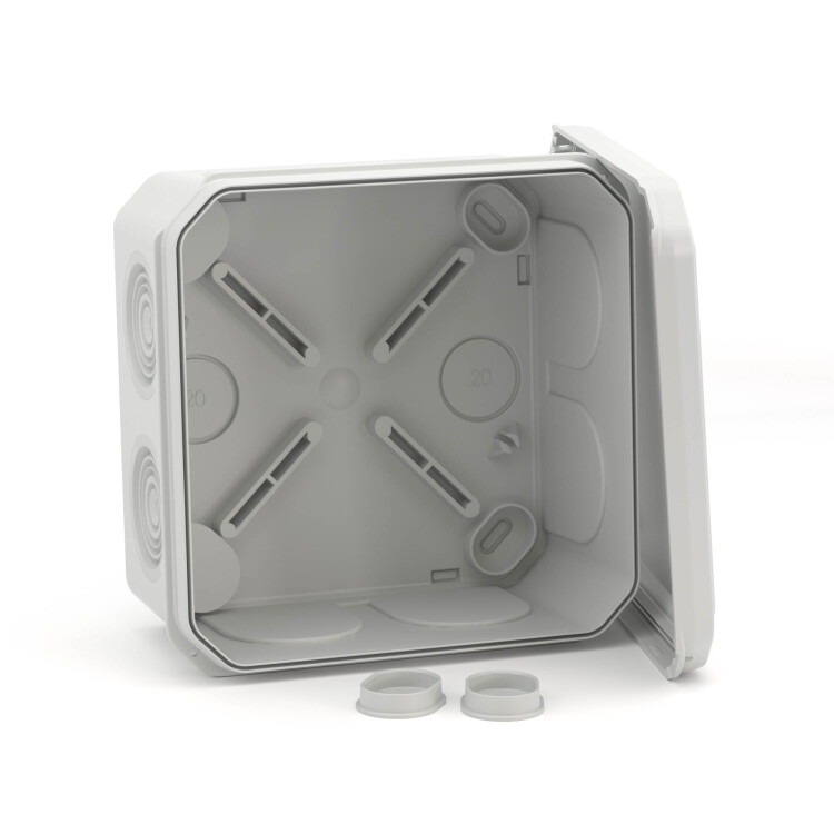 8 гермовводов – по периметру коробки, 2 отверстия – на торцевой части коробки для ввода жестких и гофрированных труб, а также кабеля. Ответвительные коробки данной серии УФ-стойкие, без содержания галогенов.