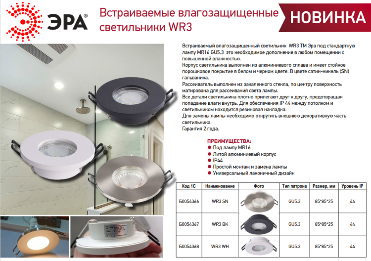 ЭРА Встраиваемый светильник влагозащищенный WR3 SN под лампу MR16 GU5.3 IP44 сатин/никель