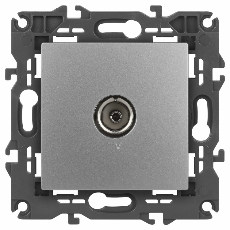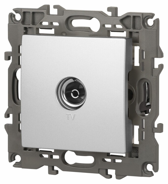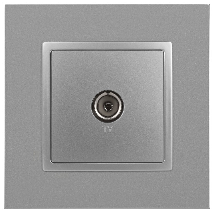 Розетка телевизионная одиночная серии Эра Elegance цвет алюминий 14-3101-03. Рамки приобретаются отдельно. Рамки Эра Elegance ПЛАСТИК: 1 пост 14-5001-хх, 2 поста 14-5002-хх, 3 поста 14-5003-хх, 4 поста 14-5004-хх, 5 постов 14-5005-хх; СТЕКЛО: 1 пост 14-5101-хх, 2 поста 14-5102-хх, 3 поста 14-5103-хх, 4 поста 14-5104-хх; МЕТАЛЛ: 1 пост 14-5201-хх, 2 поста 14-5202-хх, 3 поста 14-5203-хх, 4 поста 14-5204-хх; ДЕРЕВО: 1 пост 14-5301-хх, 2 поста 14-5302-хх, 3 поста 14-5303-хх, 4 поста 14-5304-хх (хх - код цвета: 00-прозрачный, 01-белый, белёный дуб, 02-слоновая кость, 03-алюминий, 04-шампань, 05-чёрный, чёрное дерево, 07-ясень, 09-дуб, 10-венге, 11-клён, 14-медь, 21-жёлтый, 22-оранжевый, 23-красный, 25-бордо, 26-лайм, 27-зелёный, 28-голубой, 29-синий, 30-розовый, 31-мокко, 32-серый, 41-сталь, 42-титан).