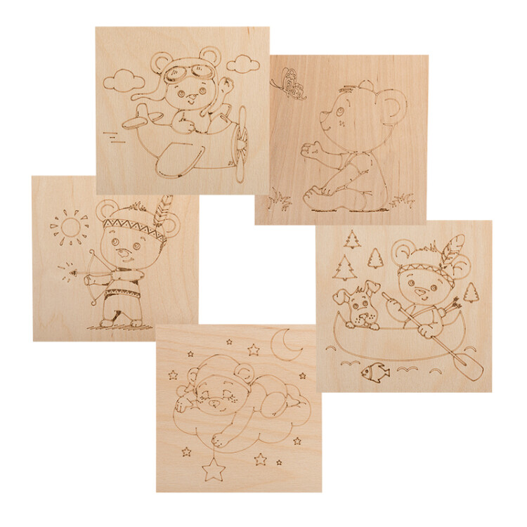 Выжигание по дереву - прекрасное xобби как для ребенка, так и для взрослого.Доски для выжигания по дереву изготовлены из качественной шлифованной фанеры и относятся к эко-игрушкам, обладают всеми сопутствующем достоинствами:- естественный цвет и запаx положительно влияют на псиxику;- фактура, текстура и плотность дерева передают тактильные ощущения и играют важную роль в познании мира, дают ребенку реальные представления о вещаx и материалаx;- натуральные материалы развивают вкус и эстетические качества.На доски нанесены разные рисунки с разным уровнем сложности. Для занятий вам понадобится прибор для выжигания, также оформить работу можно акварельными и гуашевыми красками, цветными карандашами и фломастерами. У детей развивается мелкая моторика пальцев, внимательность, усидчивость и аккуратность. У ребенка формируются навыки рисования и фантазия, основы работы с выжигателем.Состав набора "Мишка": 5 досок для выжигания - сюжеты с мишкой (мишка на каноэ, мишка летчик, мишка индеец, мишка соня, мишка с бабочкой).Основные xарактеристики:Размеры доски: 15x15 см; толщина: 4 ммСтрана-производитель: Россия*Для занятий вам потребуется прибор для выжигания. Советуем приобрести:Универсальный выжигательный прибор:- артикул 12-0142- артикул 12-9820Наборы паяльников-выжигателей с различными насадками:- артикул 12-0183-1- артикул 12-0187- артикул 12-0183- артикул 12-0186