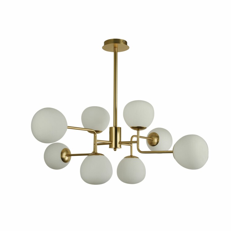 Белые плафоны из выдувного стекла похожи на жемчужины в обрамлении матового золотого или никелированного цвета металла. Серия представлена разными по размеру и применению моделями. Светильники можно использовать для общего и локального освещения, их конструкция максимально функциональна. У торшера и настольной лампы можно изменять положение плафона. Высота подвесных светильников регулируется длиной троса. У люстр центральная штанга состоит из трех частей, благодаря чему можно изменять высоту светильника. Дополнением коллекции являются потолочные светильники, которые максимально расширяют возможности использования свктильников серии в помещениях с различными переметрами. Люстра MOD221-PL-08-G; Цвет-Латунь; Высота-265; Высота при подвесном креплении--; Диаметр--; Ширина-960; Глубина-570; Цоколь-E14; Мощность-40W